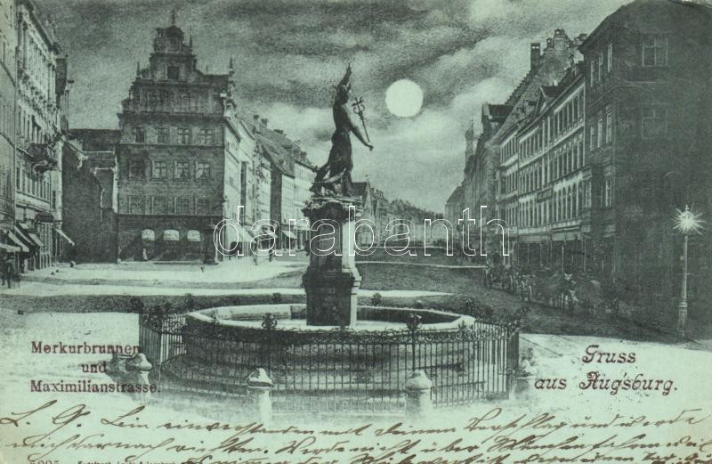 Augsburg, Merkurbrunnen, Maximilienstrasse / fountain, street, night (...