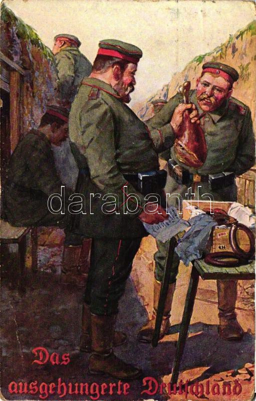 Das ausgehungerte Deutschland / The starving Germany, WWI military, meat, sausage, Kriegspostkarte No. 68. (EB)