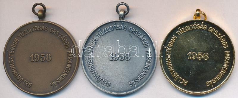 1958. "5 Éves Önkéntes Tűzoltói Szolgálatért / Belügyminisztérium Országos Tűzrendészeti Parancsnoksága" Br kitüntetés füllel (35mm) + 1958. "15 Éves Önkéntes Tűzoltói Szolgálatért / Belügyminisztérium Országos Tűzrendészeti Parancsnoksága" ezüstözött fém kitüntetés füllel (35mm) + 1958. "20 Éves Önkéntes Tűzoltói Szolgálatért / Belügyminisztérium Országos Tűzrendészeti Parancsnoksága" aranyozott fém kitüntetés (35mm) T:2