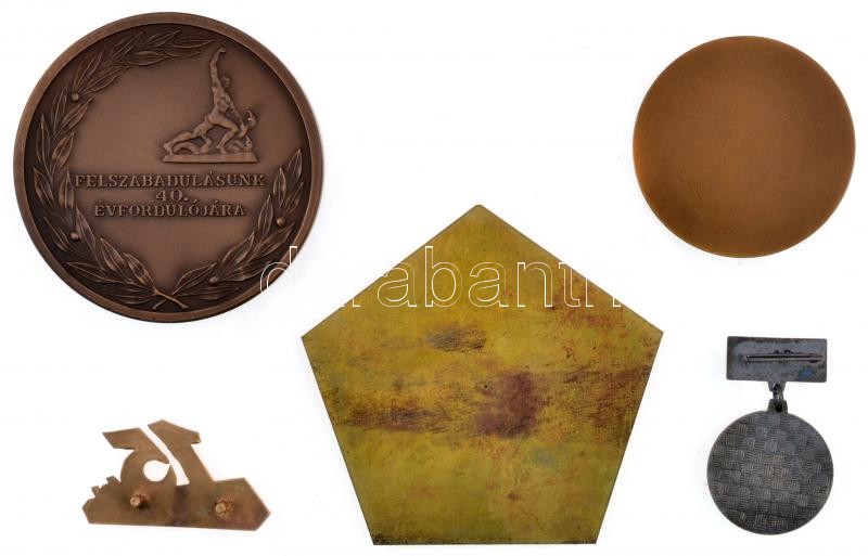 5db-os szocialista érem és jelvény tétel: ~1970. "Közösségfejlesztésért - Bács-Kiskun Megye Tanácsa" Br érem dísztokban 2db zománcozott jelvénnyel + "Érdemes társadalmi munkás" fém kitüntető jelvény dísztokban + 1971. "Szeged Cséb Autóklub Rallye" fém érem + 1985. "A Szövetkezeti Mozgalom Szolgálatáért / Felszabadulásunk 40. évfordulójára" Br emlékérem dísztokban + "15 év a magánfuvarozásban" fém jelvény T:1-,2