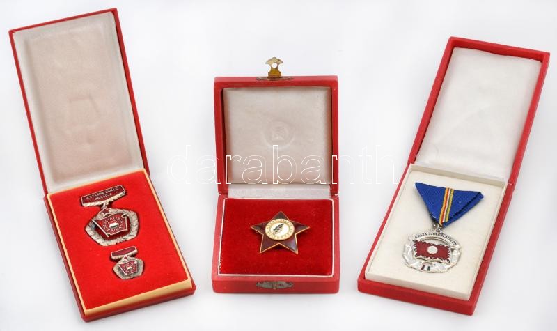 Description: ~1970. "A szakma kiváló brigádja" kitüntetés miniatűrrel dísztokban + "A szocialista kultúráért" zománcozott jelvény dísztokban + "A Haza Szolgálatáért" ezüst fokozat, ezüstözött és zománcozott fém kitüntetés mellszalaggal dísztokban T:1-,2