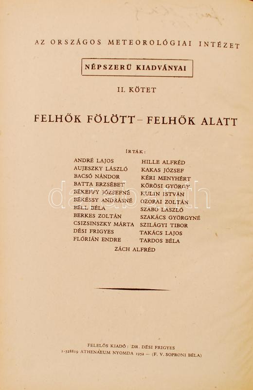 Description: Kakas József (szerk.): Felhők fölött-felhők alatt. Az Országos Meteorológiai Intézet népszerű kiadványai. II. kötet. Budapest, 1952, Athenaeum. Kiadói félvászon kötésben. Korának megfelelő állapotban.