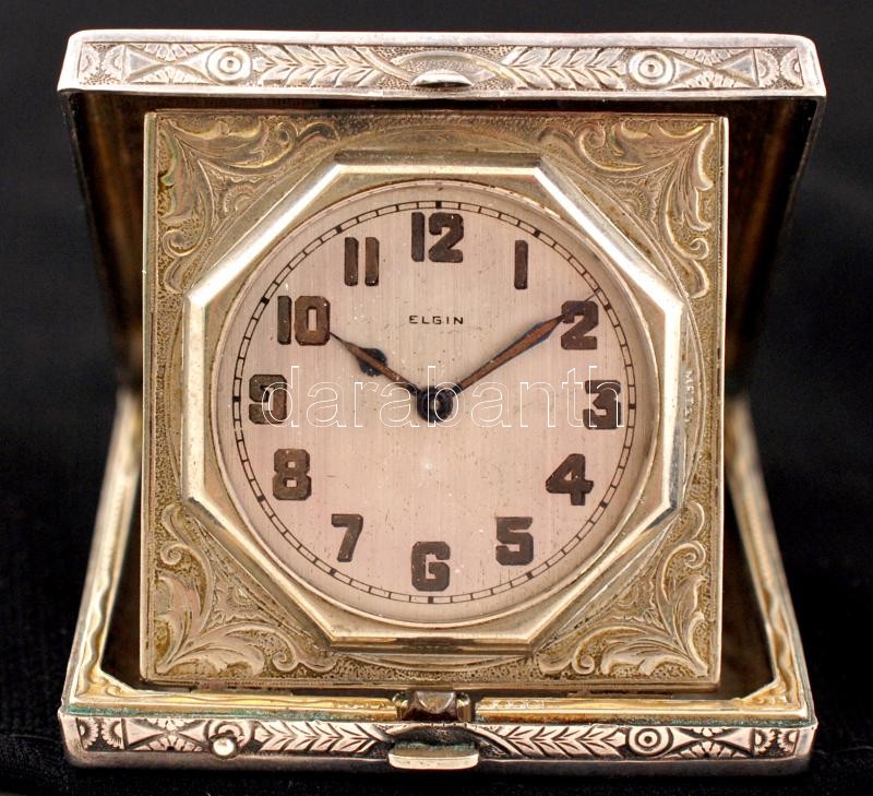 cca 1920 Elgin utazóóra "Illinois W.C.Co. Elgin Sterling" jelzésű, részben aranyozott sterling ezüst (Ag) tokban, vésett növényi ornamentikával, fedelén festett zománcozott díszítéssel. Szép állapotú, az óra jól jár / Elgin travel watch in sterling silver case with floral ornament, and enamel decoration on lid, gold plating inside, hallmarked "Illinois W.C.Co. Elgin Sterling". Watch works well, alltogether in nice condition, 6,5x6,5cm, br: 169,5gr