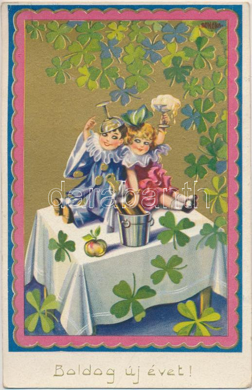 New Year, clowns, clovers, Italian art postcard, Degami 3074.