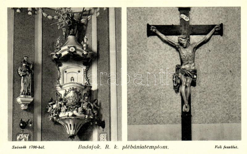 Budapest XXII. Budafok, Római katolikus plébániatemplom, Szószék 1700-ból, fali feszület, belső