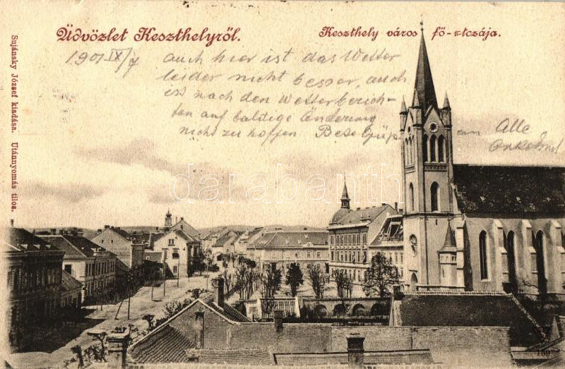 Keszthely, Fő utca, templom, Sujánsky József kiadása (kis szakadás / small tear)