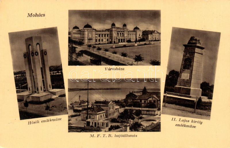 Mohács, Hősök emlékműve, városháza, M.F.T.R. Hajóállomás, II. Lajos em...