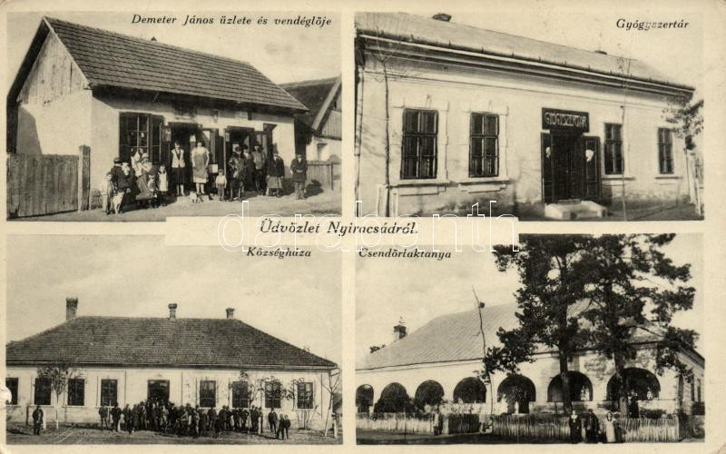 Nyíracsád, Demeter János üzlete és vendéglője, gyógyszertár, községház...