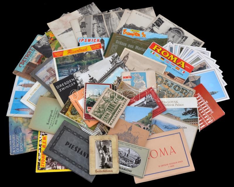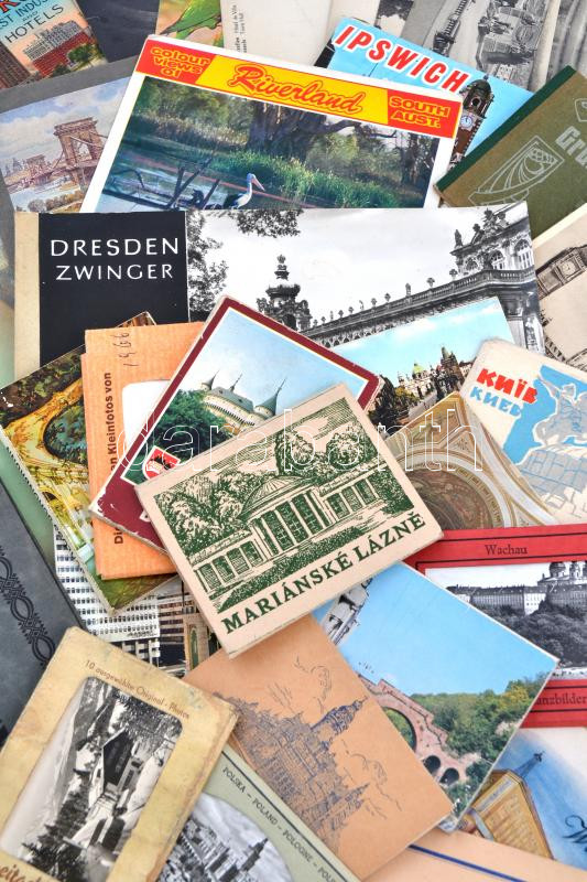Description: 142 db főleg MODERN külföldi városképes lap, leporellolapokban, képeslapfüzetekben, saját tokjukban; pár mini leporelloval dobozban / 142 mostly modern foreig town-view poscards in leporellocards, postcard booklets and in their own cases; with some mini leporellos in a box