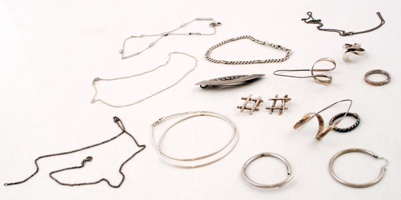 Vegyes ezüst (Ag.) tétel: fülbevalók, gyűrűk, nyakláncok, némelyik kő berakással, egy részük jelzett, összesen bruttó 60 g