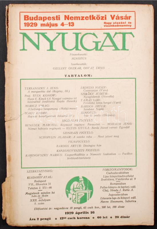 https://www.darabanth.com/en/248-Online-auction/248.0/Other-collectibles/Printed-Materials~200007/1929-A-Nyugat-cimu-folyoirat-XXII-evfolyamanak-8-szama-benne-Benedek-Marcell-Ignotus-Ters~II1048346