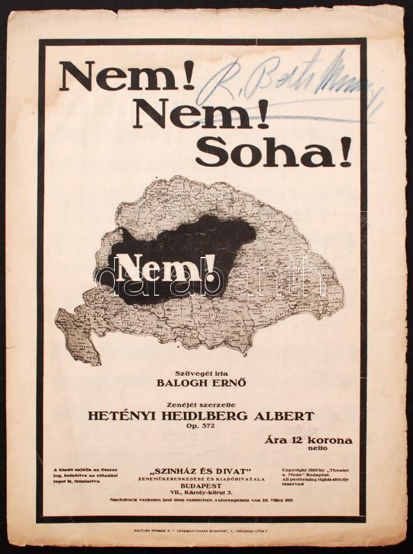 cca 1920 Nem! Nem! Soha! irredenta dal kottája, szövegét és zenéjét sz... https://www.darabanth.com/en/248-Online-auction/248.0/Other-collectibles/Printed-Materials~200007/cca-1920-Nem-Nem-Soha-irredenta-dal-kottaja-szoveget-es-zenejet-szerezte-Balogh-Erno-es-~II1186734