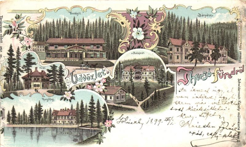 Description: 1899 Thurzófüred, Vendéglő, Bányász, Budapest, Hygiea és Thurzóház szállók, fürdő / restaurant, hotels, spa; Schwidernoch Károly 3252. sz. floral. Art Nouveau litho (b)