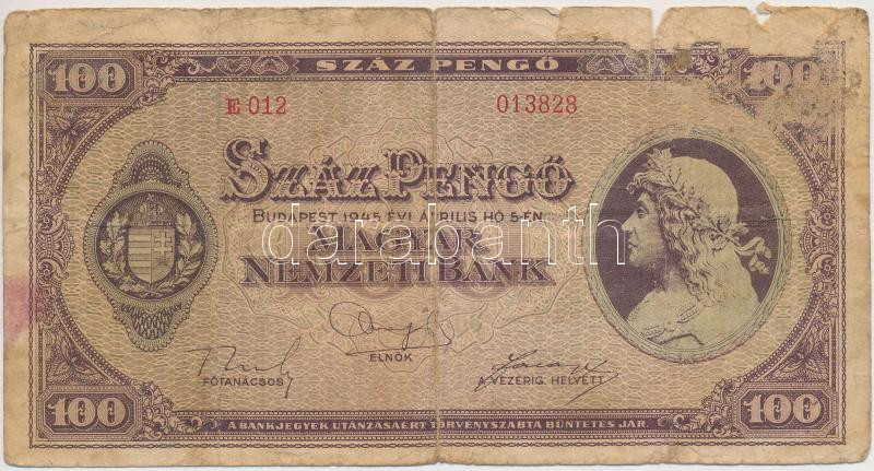 1945. 100P "E 011", vízjeles, "BÜNTETÉS" szóban "N" felett lemezhiba T:III-