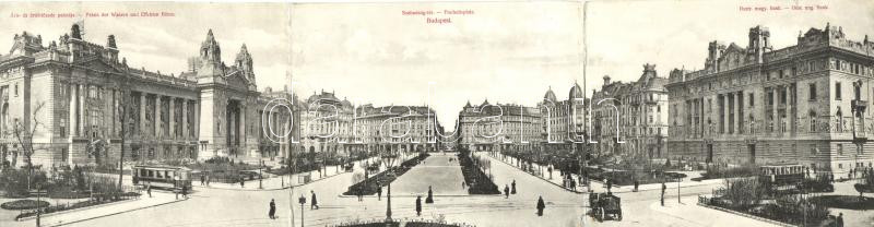 Description: Budapest V. Szabadság tér, Áru és értéktőzsde palotája, Osztrák-magyar bank, villamosok, Nagy kávéház; Divald Károly, nagy méretű panorámalap (14 cm x 54 cm) (r)