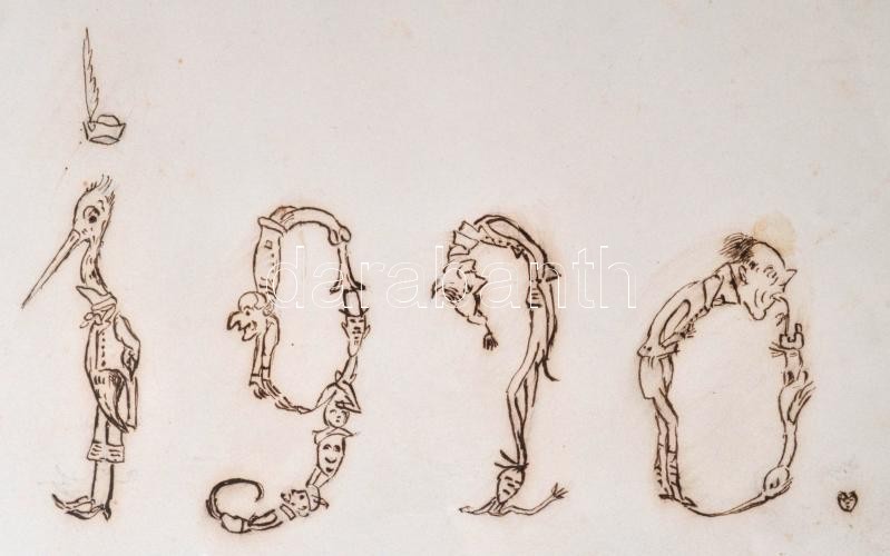 Meiner Pia von der Alten. 1920. - szép bőrkötésű könyv. A könyv 133 darab groteszk grafikákat, karikatúrákat tartalmaz egy pontosan be nem azonosított művésztől. A munkák között többségében akvarellek, valamint néhány ceruza és tusrajz is található. Az első oldalon 1920, majd Meriner Pia von der Alten feliratok olvashatók. A könyvben két képnél aláírás található. 1. Két beragasztott kép egyikén Kovácsy felirat. Amely talán a XX. század fordulóján, elején élt grafikushoz, Kovácsy Endréhez, aki Kner Izidor Röpke Lapok c. kiadványában is alkotott, köthető. 2. A második aláírásnál egy beragasztott kép, és egy rajz található. A beragasztott képen Julian Pejacsevich felirat olvasható, ami feltehetőleg Julian Pejacsevich (1833-1906) idősödő grófot ábrázolja. A könyv művésze pontosan beazonosítatlan, de a Pejacsevich gróf környezetéhez köthető, Id. Storno Ferenc (1821-1907) kiváló művész, akinek talán valamelyik szintén kimagasló művészi tehetséggel megáldott családtagja (fia, unokája?) készítette a rajzokat. (Ifj. Storno Ferenc (1851-1938), Storno Kálmán (1858-1934) ) / Meiner Pia von der Alten. 1920. It is a beautiful leather binding book and It contains 133 of piecies grotesque art works, and caricatures from an unknown artist. The main part of the art works are watercolours, and it includes some crayon-drawings, and tint-drawings. We read on the first two pages: 1920 and Meiner Pia von der Alten. The book includes two autographs. 1. Kovcsáy and 2. Julián Pejacsevich. 1. Maybe Kovácsy was the Hungarian graphic artist Kovácsy Endre, who lived in the beginning of the 20th century. 2. Julián Pejacsevich (1833-1906) was a Hungarian nobleman. The artist is unknown, but in the surroundings of Pejacsevich worked Ferenc Storno (1821-1907) artist and maybe either he, or one of his sons (or grandson) made the artworks (Ifj. Storno Ferenc (1851-1938), Storno Kálmán (1858-1934)) The cover is a little bit tattered, but the alltogether in good condition.