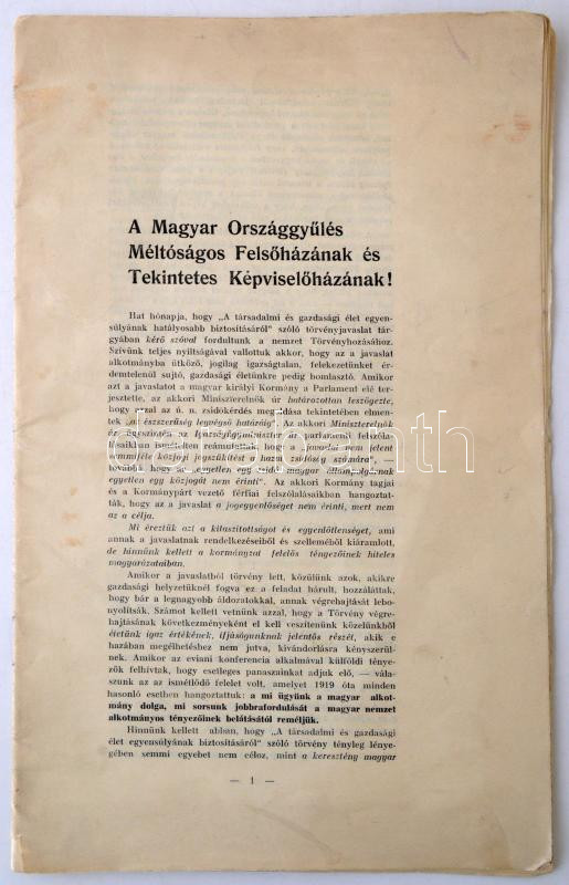 Description: 1939 Tiszteletteljes Folyamodása a Magyar Izraelita Vallásfelekezet Törvényes Képviseleti Szerveinek ,,a zsidók közéleti és gazdasági korlátozásáról szóló 702. sz. törvényjavaslat" tárgyában. Az országgyűlésnek szóló tiltakozó memorandum a készülő második zsidótörvény ellen.
