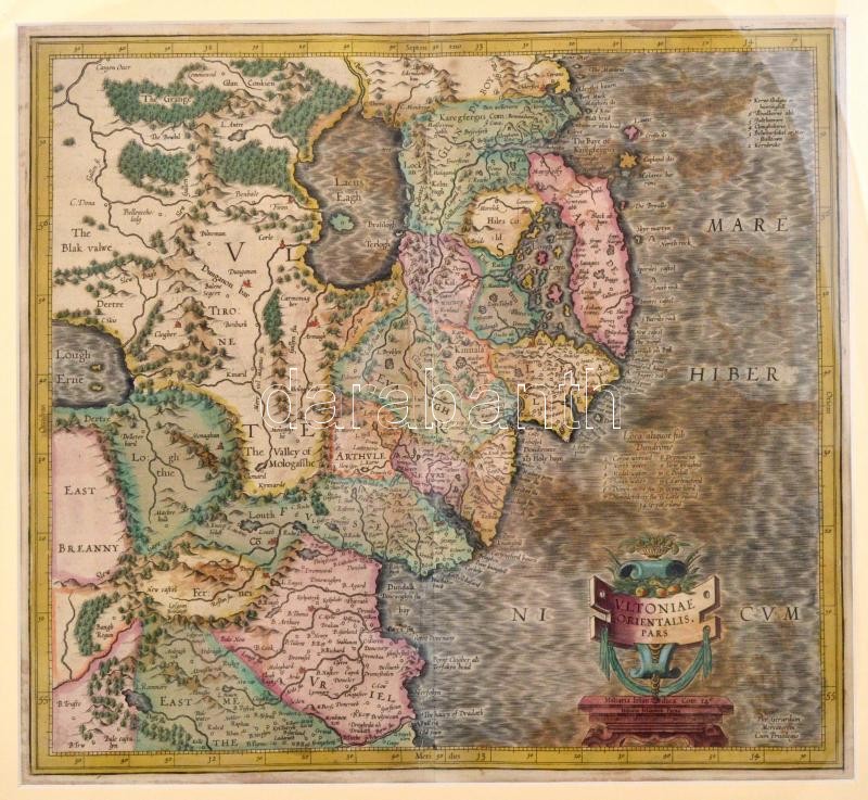 Description: cca 1606 Gerhard Mercator (1512-1594) - (Hondius kiadása): Ultoniae orientalis pars. Militaria Irlandica - Írország keleti részének térképe. Színezett rézmetszet, szép állapotban, igényes üvegezett keretben. / Mercator - Hondius: Map of Ireland, Eastern Part. Handcolored etching. 40x36 cm In glazed frame 63x52 cm