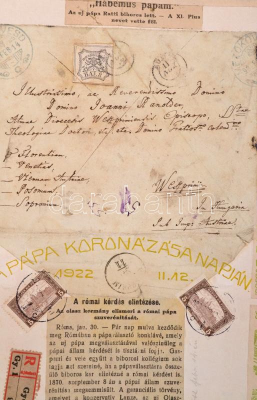Description: 1922 Schima Bandi (1882-1959): Habemus papam. A pápaválasztásra készült rajz, hátoldalán újságcikkek, kivágások.. vegyes technika, papír, jelzett. / We have a pope. Mixed technique. With articles on the back 23x39 cm
