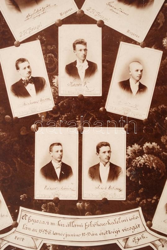 Description: 1896 Fogarasi m. kir. állami felsőkereskedelmi iskola végzős diákjai, kistabló 14 feliratozott portréval, J. H. Briegel műterméből, 29x24 cm, karton 32x26 cm