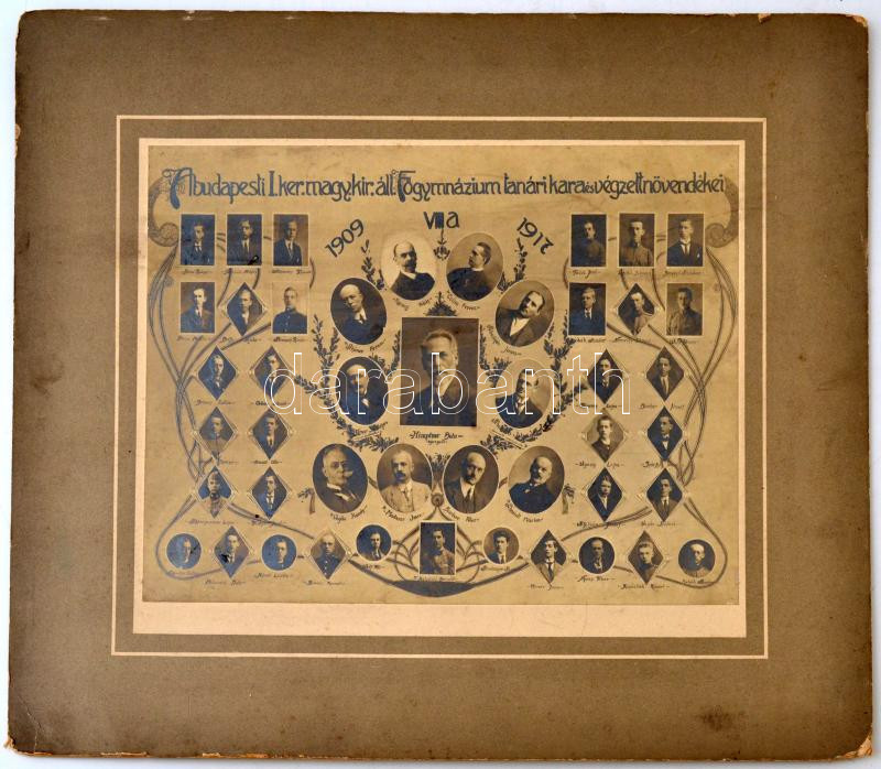 1917 Budapest, I. ker., magy. kir. áll. Főgimnázium tanári kara és végzett növendékei, kistabló 46 nevesített portréval, 22x29 cm, karton 36x42 cm