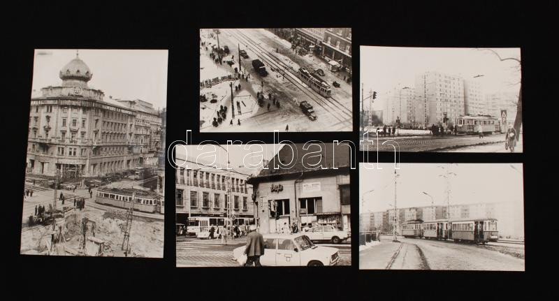 1963-1985 Budapesti villamosok tétele, a 33, 3, 12, 4 és még két olyan járat, ami meghatározást igényel, helyszínek, időpontok feliratozva, 5 db vintage fotó, 9x13 cm és 13x18 cm