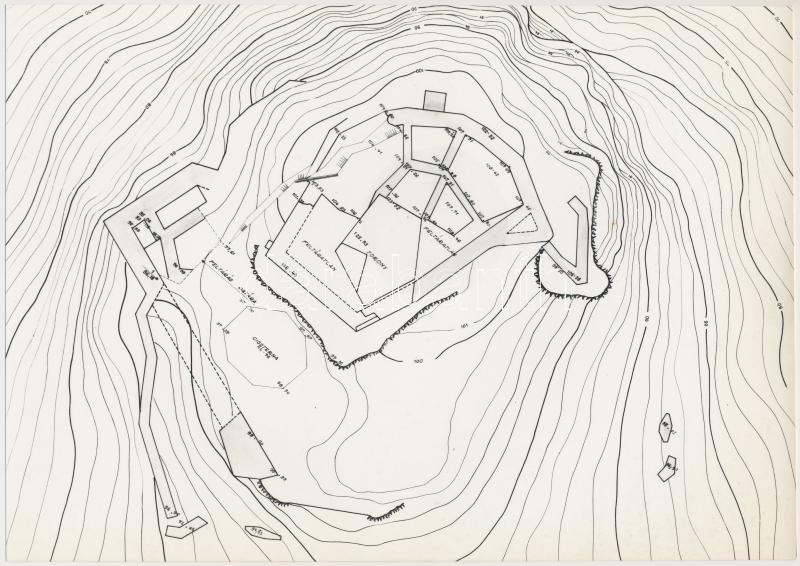 cca 1966 Hollókői várrom madártávlatból, szemmagasságból és sztereoautográffal készült 1:200-as arányú helyszínrajza, 3 db vintage fotó, 19x27 cm