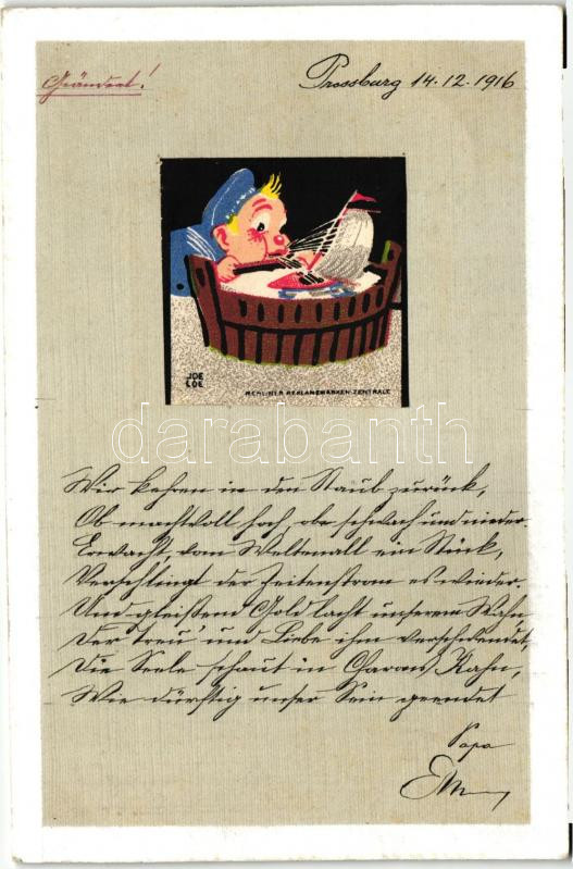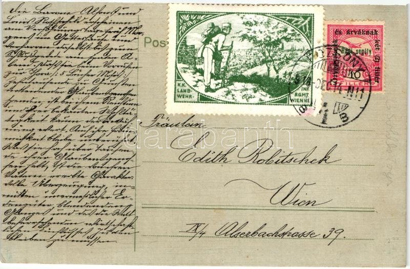 Description: G. Söhlkes Spielwaren, Berliner Reklamemarken-Zentrale. Német játékgyárnak készített levélzáró képeslapon, hátoldalon szép K.u.K. Landwehr katonai levélzáró / German Advertising Label on postcard s: Joe Loe
