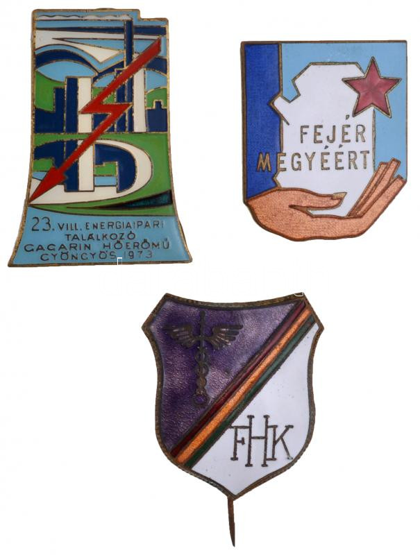 1973. "23. Villamos Energiaipari Találkozó - Gagarin Hőerőmű Gyöngyös 1973" zománcozott fém jelvény + ~1980. "Fejér megyéért" zománcozott fém jelvény + ~1930. "FHK" budapesti kereskedelmi középiskola zománcozott fém jelvénye, hátlapon forrasztásnyom T:1-,2