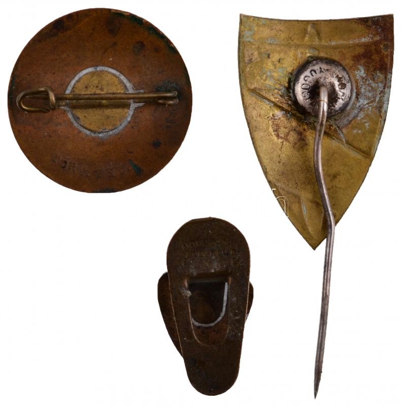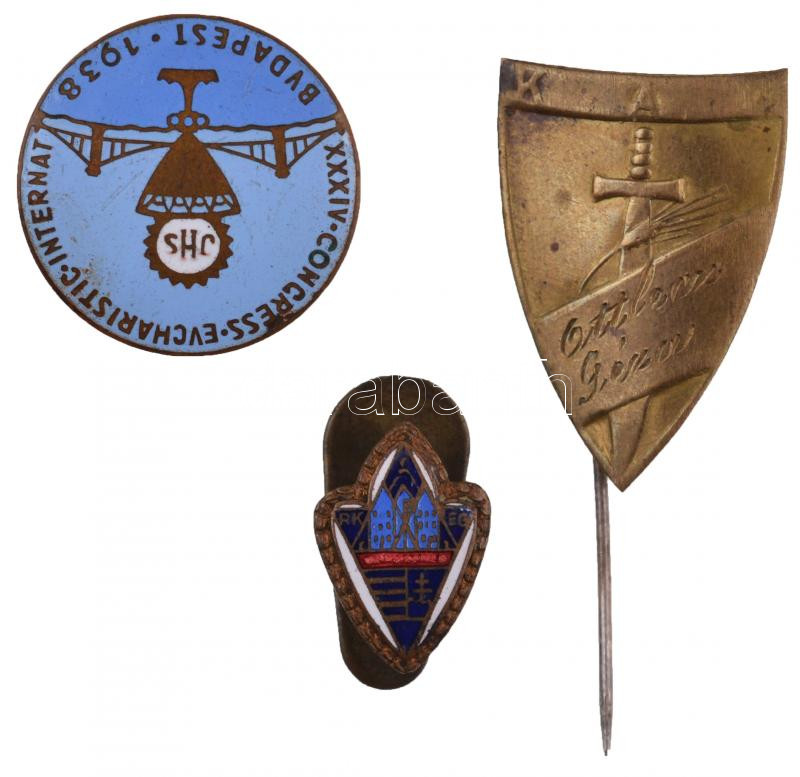 Description: 3db-os jelvény tétel, ebből kettő zománcozott, benne "1938. "XXXIV. Nemzetközi Eucharisztikus Kongresszus Budapest", "RKEG" jelvény "MORZSÁNYI BUDAPEST ESKÜ UT 5." gyártói jelzéssel T:2,2-