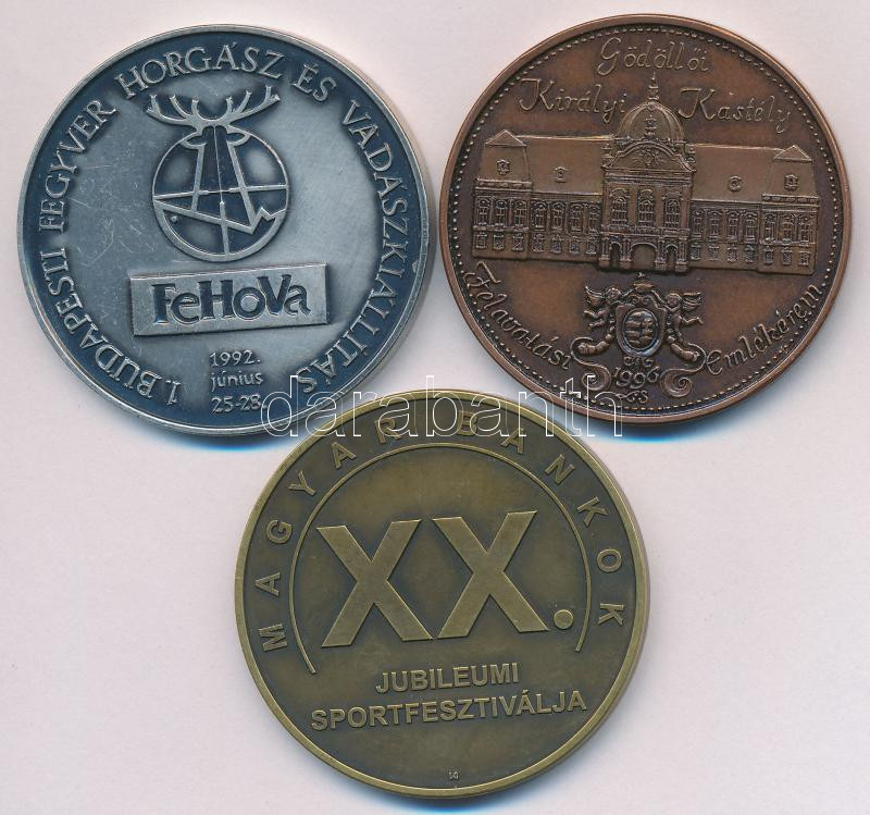 1992. "1. Budapesti Fegyver, Horgász és Vadászkiállítás / VEFAG - Tatabánya" fém emlékérem (42,5mm) + 1997. "Gödöllői Királyi Kastély - 1996 Felavatási Emlékérem / Caterpillar Hungary Ltd. 1992-1997 - 5. évforduló" Br emlékérem (42,5mm) + Kiss István (1927-) 2008. "Magyar Bankok XX. Jubileumi Sportfesztiválja / OTP Bank - Nyíregyháza" Br emlékérem (42,5mm) T:2