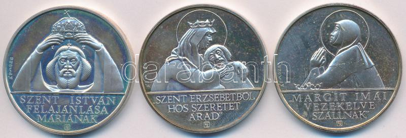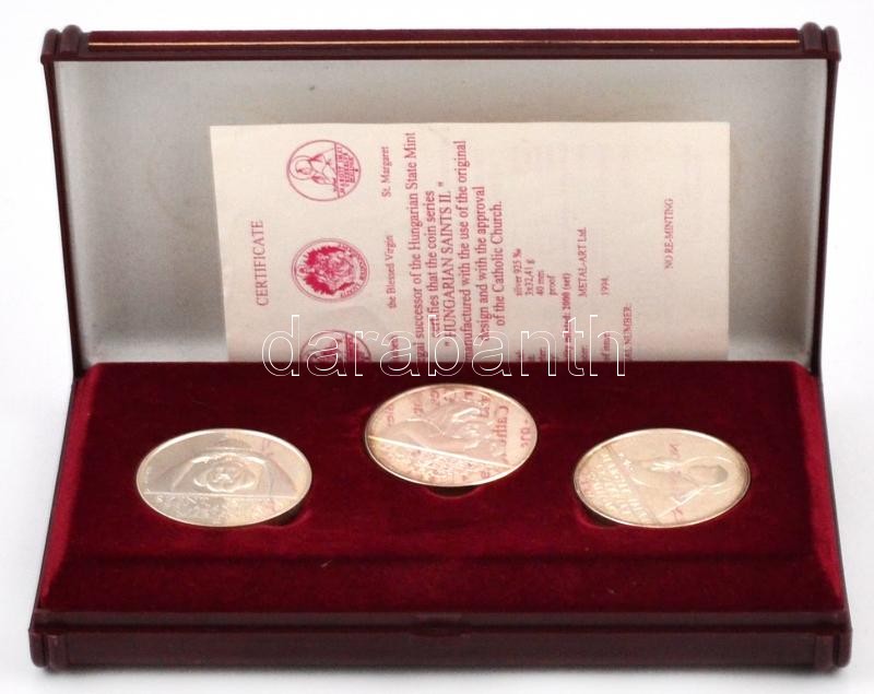 Description: Fülöp Zoltán (1951-) 1994. "Magyar Szentek II. - Szent Erzsébet, Nagyboldogasszony, Szent Margit" 3xklf db-ból álló Ag emlékérem szett eredeti dísztokban sorszámozott tanúsítvánnyal (32,4g/0.925/40mm) T:PP kis ujjlenyomat, felületi karc