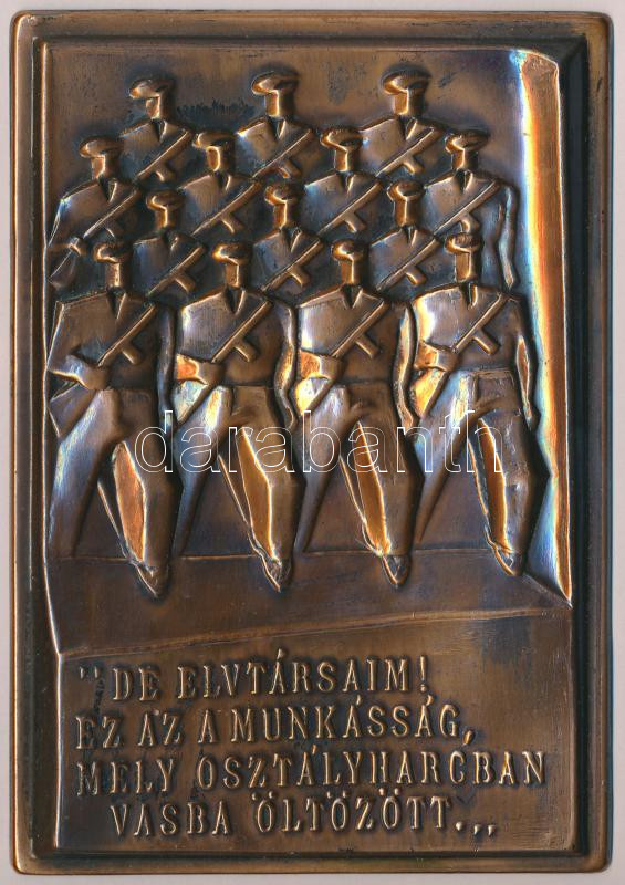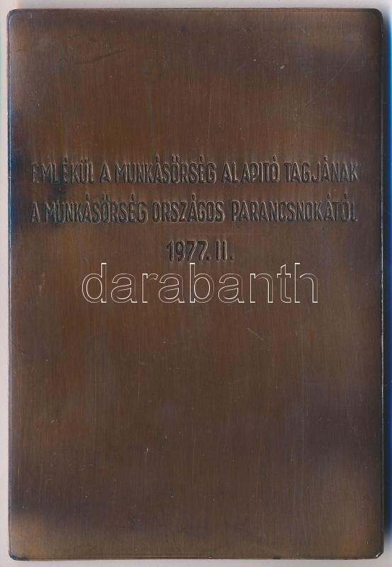 Description: Kiss Nagy András (1930-1997) 1977. "De elvtársaim! Ez az a munkásság, mely osztályharcban vasba öltözött... / Emlékül a Munkásőrség alapító tagjának a Munkásőrség országos parancsnokától 1977. II." vörösréz emlékplakett (104x71mm) T:2,2-