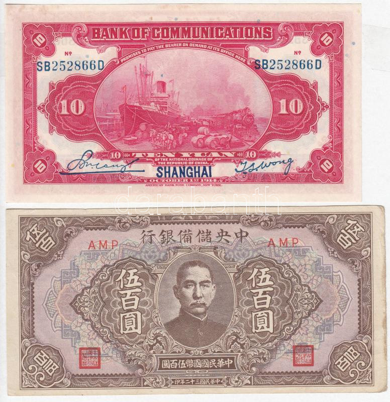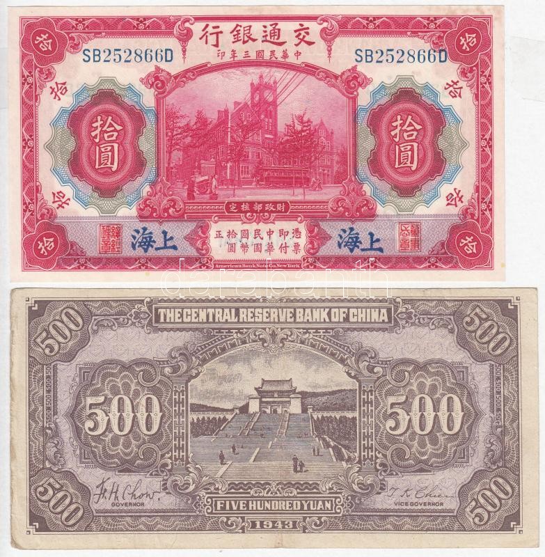 Description: Kína / Bank of Communications 1914. 10Y kék-fekete sorszám és "SHANGHAI" felirat + Japán megszállás / The Central Reserve Bank of China 1943. 500Y T:I,III