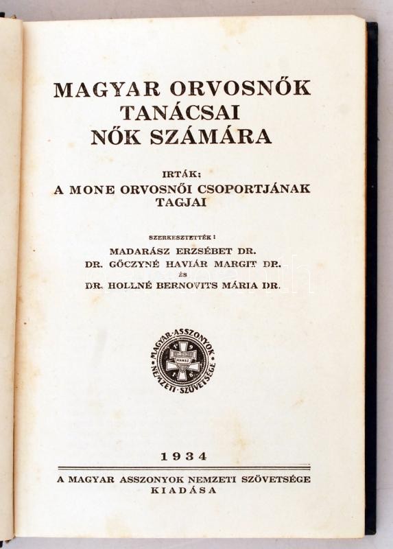 Madarász Erzsébet-Gőczyné Havaiár Margit-Hollné Bernovits Mária(szerk.): Magyar orvosnők tanácsai nők számára. Bp., 1934, Magyar Asszonyok Nemzeti Szövetsége. Kiadói egészvászon kötés, enyhén állapotban.