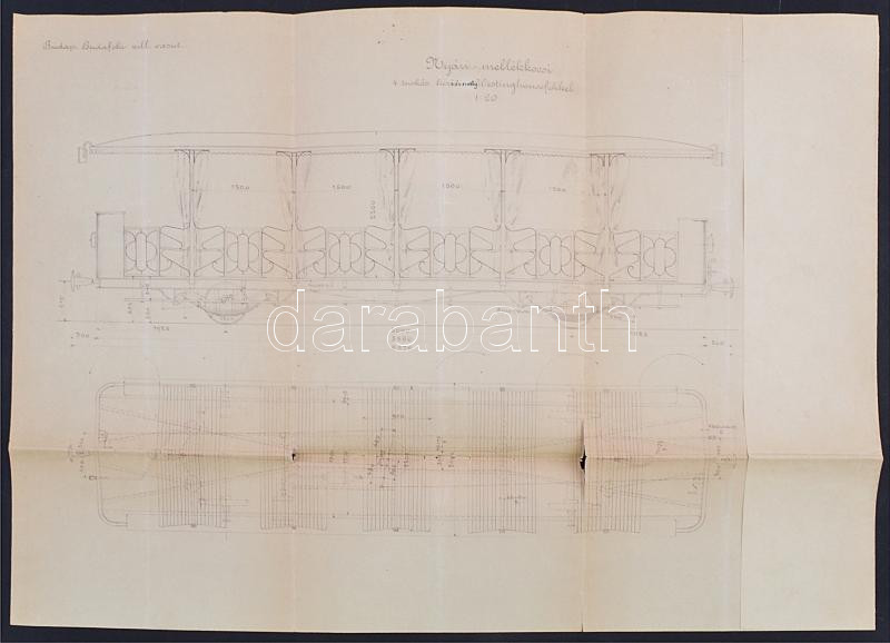 1905 Ganz És Társa Vasuti kocsi Építési Osztály terve Nyári-mellékkocsi 4 tuskós kézi és esetleg Westinghousefékkel, 1:20, 48x71cm