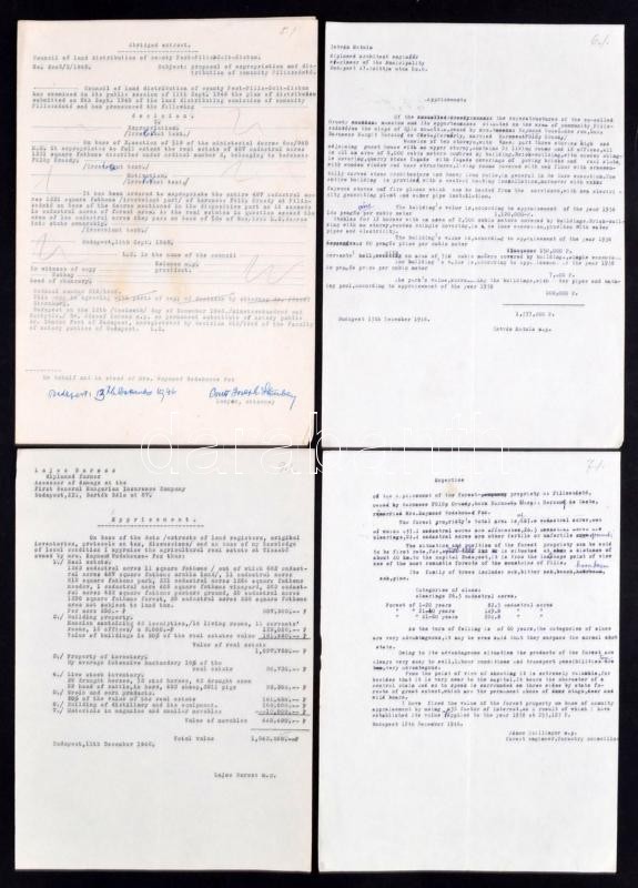 Description: 1946 Wodehouse-Fox Raymondné kárpótlási anyaga a háborúban megsemmisült VII. Damjanich u. 12. alatti palota és a Pilisszántói kastély tárgyában. Kárfelmérés és leltár. 10 gépelt irat.
