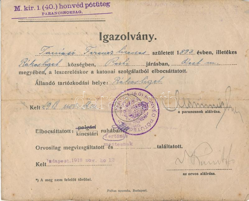 https://www.darabanth.com/en/250-Online-auction/250.0/Other-collectibles/Military~1400002/1918-Bp-A-M-kit140-honved-potuteg-parancsnoksag-altal-kiadott-leszerelesi-igazolas~II1201248
