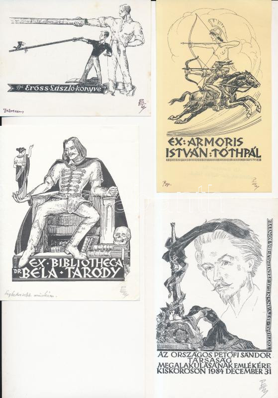 Fery Antal (1908-1944): 4 db ex libris, klisé, papír, jelzettek, cca 15x10cm és 11x8cm között