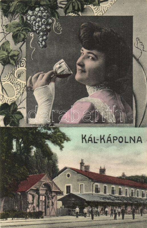Kál-Kápolna, vasútállomás, szőlő, hölgy borospohárral