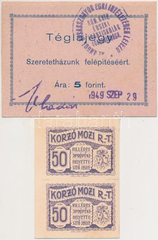 Description: Eger 1949. "Az Angolkisasszonyok Egri Intézetében Létező Római Katolikus Érseki Leányiskolák Igazgatósága - Szeretetházunk felépítéséért" 5Ft értékű téglajegy, bélyegzéssel + Szeged DN "Korzó Mozi Rt." 50f (2x) 2-es ívben T:I,II