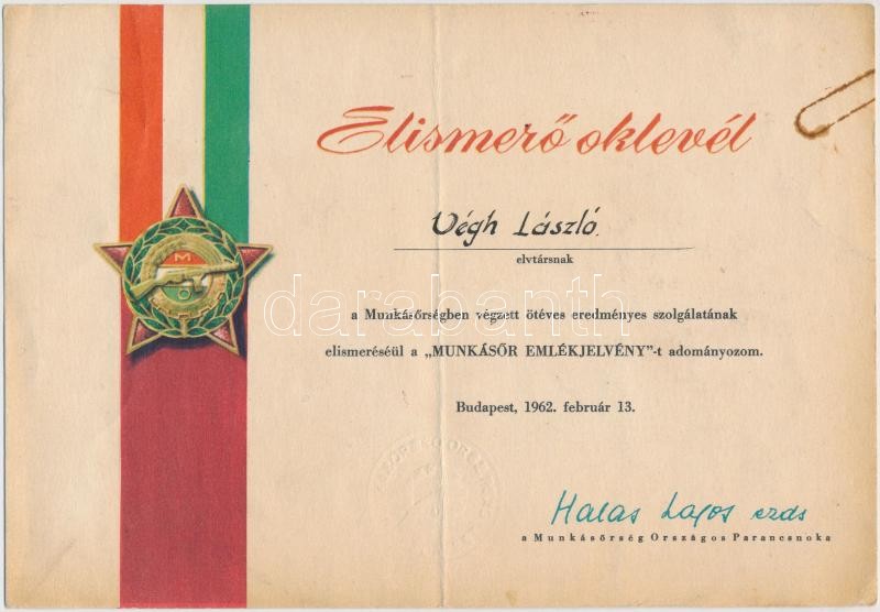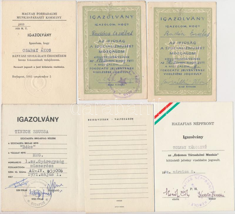 6db-os kitüntetés igazolvány tétel, közte 1965. "Bányász Szolgálati Érdemérem" bronz fokozatának igazolványa, 1980. "Érdemes Társadalmi Munkás" jelvény igazolványa