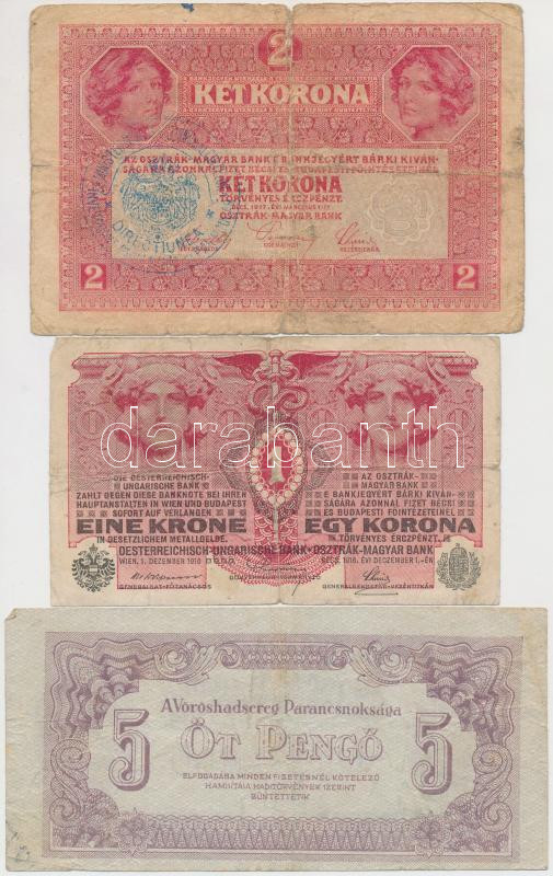 https://www.darabanth.com/en/251-Online-auction/251.0/Numismatics/Hungarian-Banknotes~7/1916-1K-plus-1917-2K-felulbelyegzessel-plus-1944-5P-A-Voros-Hadsereg-Parancsnoksaga-TIII-III-~II1208542