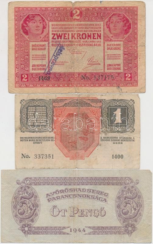 1916. 1K + 1917. 2K felülbélyegzéssel + 1944. 5P "A Vörös Hadsereg Parancsnoksága" T:III,III-