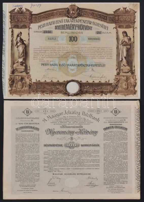 Description: Budapest 1906. "Pesti Hazai Első Takarékpénztár-Egyesület" nyeremény-kötvénye 100K-ról + 1906. "A Magyar Jelzálog-Hitelbank Konverzionális Nyeremény-Kötvény" A és B részkötvénye 100K-ról, egy ívben, szárazpecséttel T:II,II-