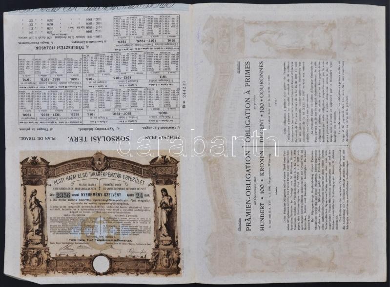 Budapest 1906. "Pesti Hazai Első Takarékpénztár-Egyesület" n... https://www.darabanth.com/en/251-Online-auction/251.0/Numismatics/Shares-and-Tickets~5/Budapest-1906-Pesti-Hazai-Elso-Takarekpenztar-Egyesulet-nyeremeny-kotvenye-100K-rol-plus-19~II1209154