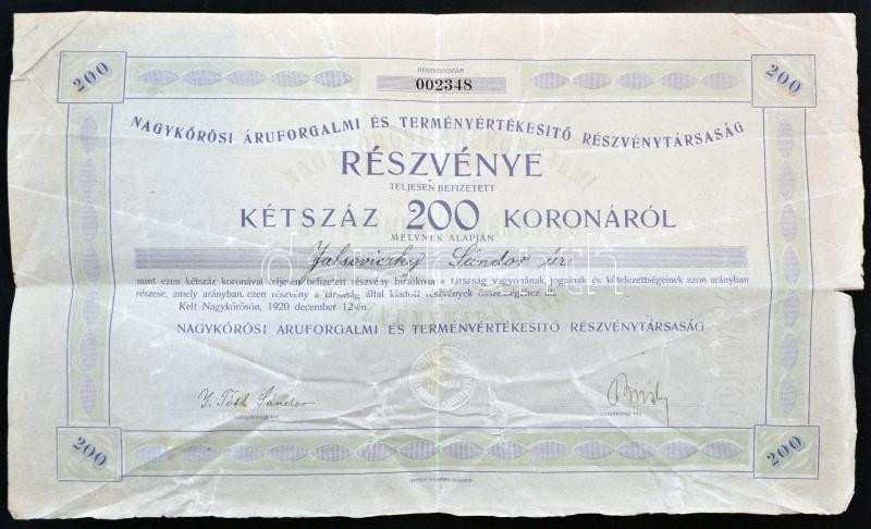 Nagykőrös 1920. "Nagykőrösi Áruforgalmi és Terményértékesítő Részvénytársaság" részvénye 200K-ról szelvényekkel T:III