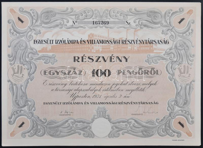 Újpest 1931. "Egyesült Izzólámpa és Villamossági Részvénytársaság" részvénye 100P-ről T:I,I-