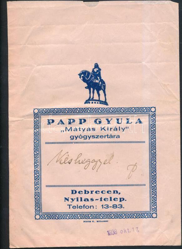 https://www.darabanth.com/en/251-Online-auction/251.0/Other-collectibles/Advertisement~600032/1938-Papp-Gyula-Matyas-Kiraly-gyogyszertara-Debrecen-papirtasak-20x14cm~II1213475