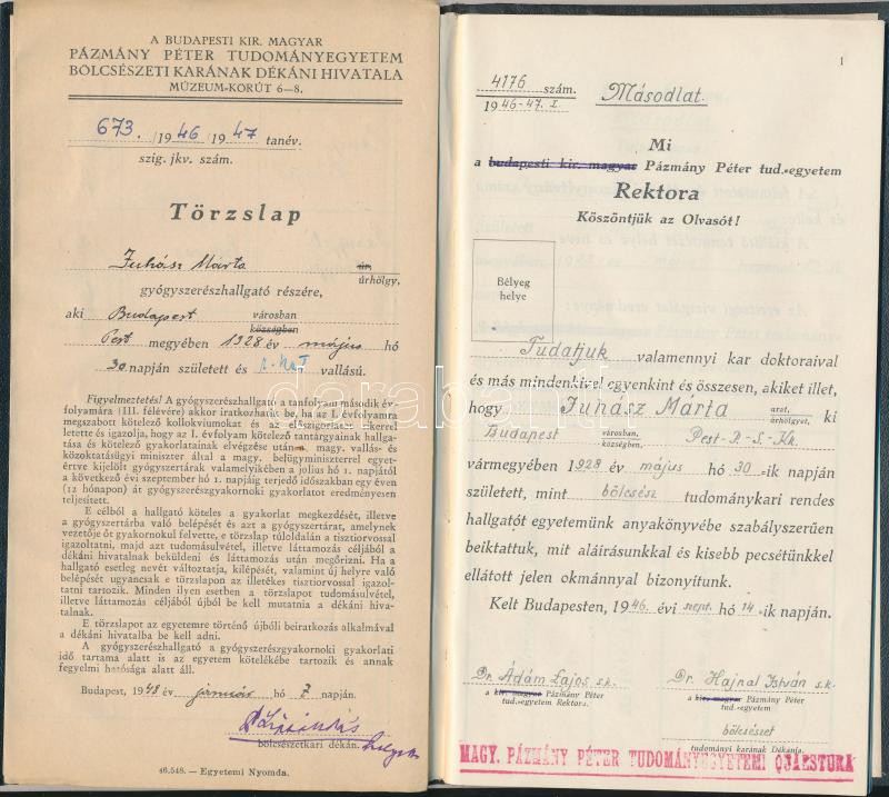 A Pázmány Péter Tudományegyetem által kiadott leckekönyv és törzslap g... https://www.darabanth.com/en/251-Online-auction/251.0/Other-collectibles/Autographs~600028/A-Pazmany-Peter-Tudomanyegyetem-altal-kiadott-leckekonyv-es-torzslap-gyogyszereszhallgato~II1209589
